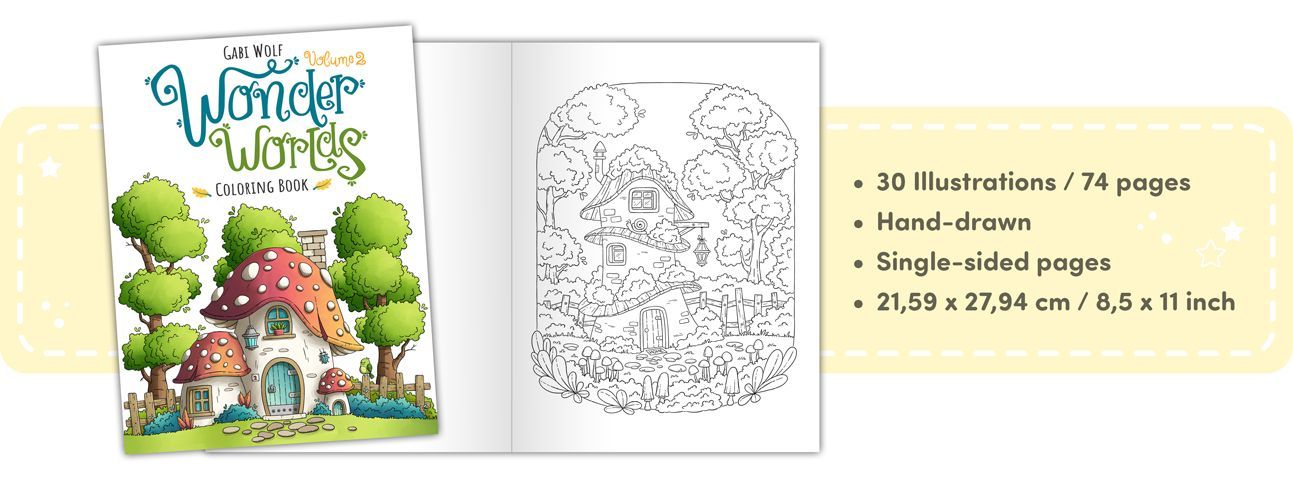 The journey into the world of wonder continues. 30 hand-drawn illustrations invite you to fill them with color. Funny insects, tiny houses and idyllic landscapes are just some of the things to be found in this book. Choose your favorite colors and make the pictures shine.